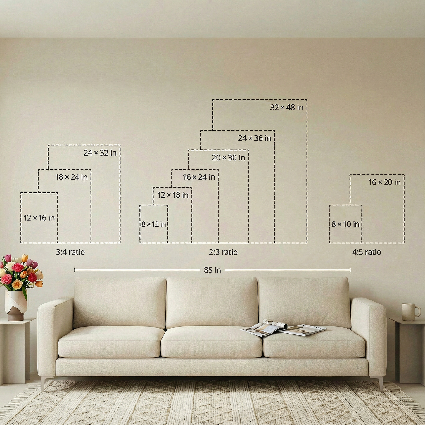 • Why? Interior designers suggest art should cover 60-80% of your sofa's width. A large piece creates a stunning focal point and pulls the room together.